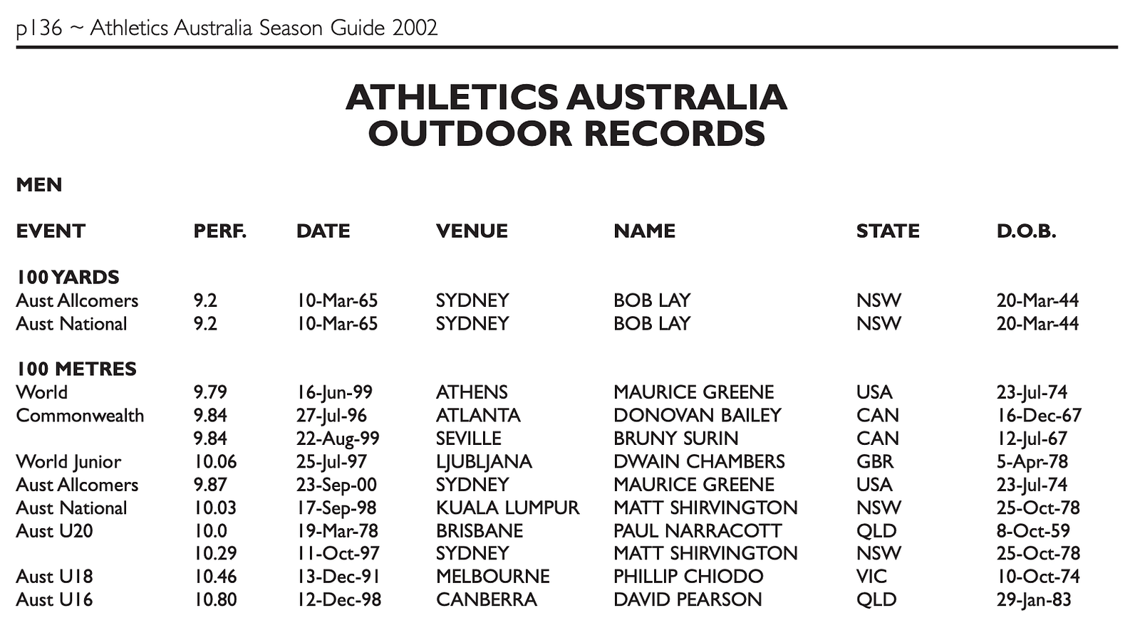 The last time the 100 yards was listed as an Australian record was in the Athletics Australian 2003 Season Guide. The season guide for the following year – 2004 – the record was relegated to a footnote as a “Best on Record”.